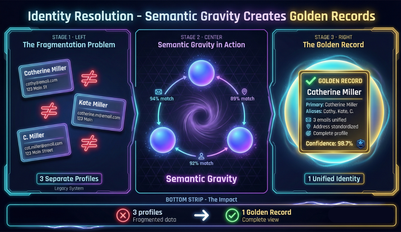Common names are the Achilles heel of traditional matching. DarkMatch treats each identity as a vector centroid and analyzes the full constellation of attributes: spending habits, device usage, location patterns, and life stage. Two "John Smiths" at the same address, father and son, are separated with 99% confidence based on behavioral divergence. The system detects two distinct gravity wells rather than forcing a false merge.